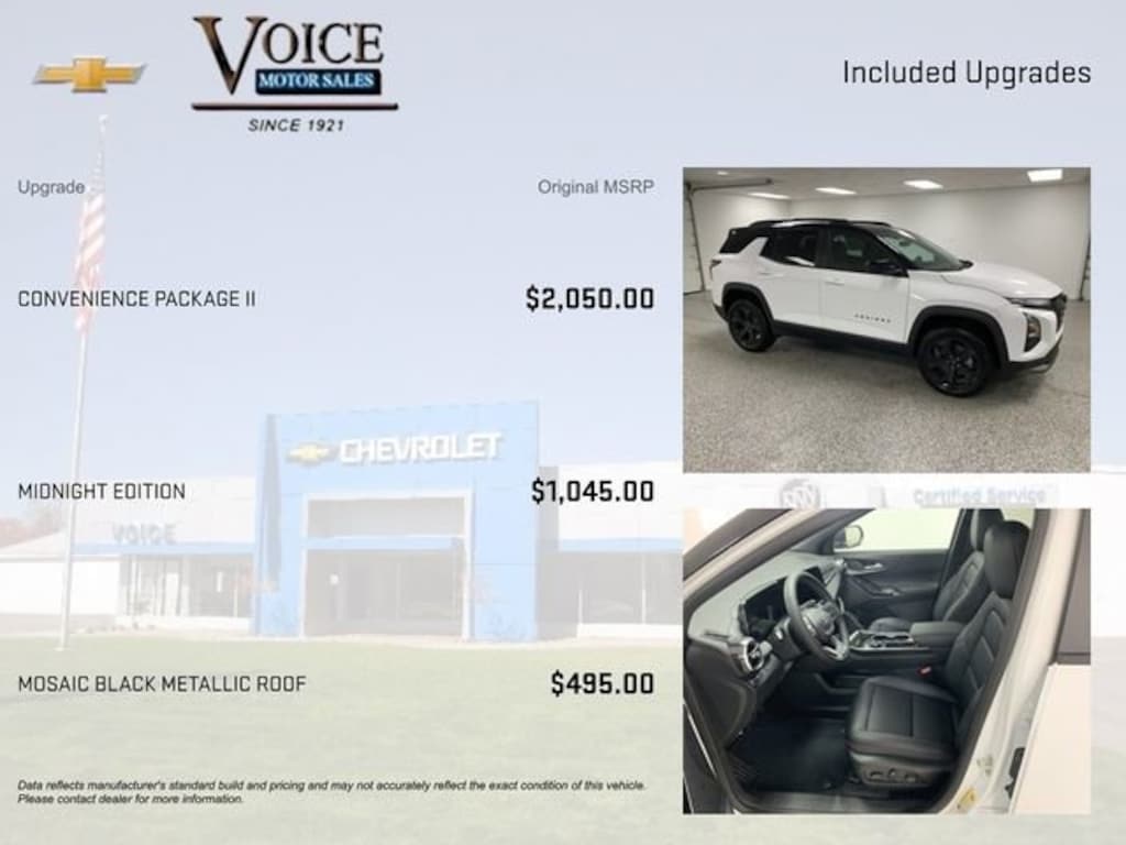 Black w/Evotex Seat Trim, 2-Way Power Driver Lumbar Control Seat Adjuster, 3.47 Final Drive Axle Ratio, 4-Wheel Disc Brakes, 6 Speakers, ABS brakes, Air Conditioning, Alloy wheels, AM/FM radio: SiriusXM, Auto High-beam Headlights, AutoSense Hands-Free Power Programmable Liftgate, Brake assist, Bumpers: body-color, Cabin Humidity & Windshield Sensor, Cloth Seat Trim, Compass, Convenience Package II, Delay-off headlights, Driver 6-Way Manual Seat Adjuster, Driver 8-Way Power Seat Adjuster, Driver door bin, Driver vanity mirror, Dual front impact airbags, Dual front side impact airbags, Dual-Zone Automatic Climate Control, Electronic Stability Control, Emergency communication system: OnStar and Chevrolet connected services capable, Evotex Seat Trim, Four wheel independent suspension, Front anti-roll bar, Front Bucket Seats, Front Center Armrest, Front Passenger 4-Way Manual Seat Adjuster, Front reading lights, Fully automatic headlights, Heated door mirrors, Heated Driver & Front Passenger Seats, Heated front seats, Heated steering wheel, Heated Wiper Park, High Gloss Black Mirror Caps, Illuminated entry, Intermittent Front Rain-Sensing Wipers, Low tire pressure warning, Midnight Edition, Mosaic Black Metallic Roof, Mosaic Black Mirror Caps, Navigation System, Occupant sensing airbag, Outside temperature display, Overhead airbag, Overhead console, Overhead Sunglass Storage, Panic alarm, Passenger door bin, Passenger vanity mirror, Power door mirrors, Power steering, Power windows, Preferred Equipment Group 2LT, Premium audio system: Chevrolet Infotainment 3, Programmable Universal Home Remote, Radio data system, Radio: 11.3 Diagonal Advanced Color LCD Display, Rear anti-roll bar, Rear reading lights, Rear seat center armrest, Rear window defroster, Rear window wiper, Remote keyless entry, Roof Rails, Security system, SiriusXM w/360L Trial Subscription, Speed control, Speed-sensing steering, Split folding rear seat, Spoiler, Steering wheel mounted audio controls, Tachometer, Telescoping steering wheel, Tilt steering wheel, Traction control, Trip computer, Variably intermittent wipers, Wheels: 19 Black Painted Aluminum, Wireless Phone Charging for Portable Devices, Black w/Evotex Seat Trim.