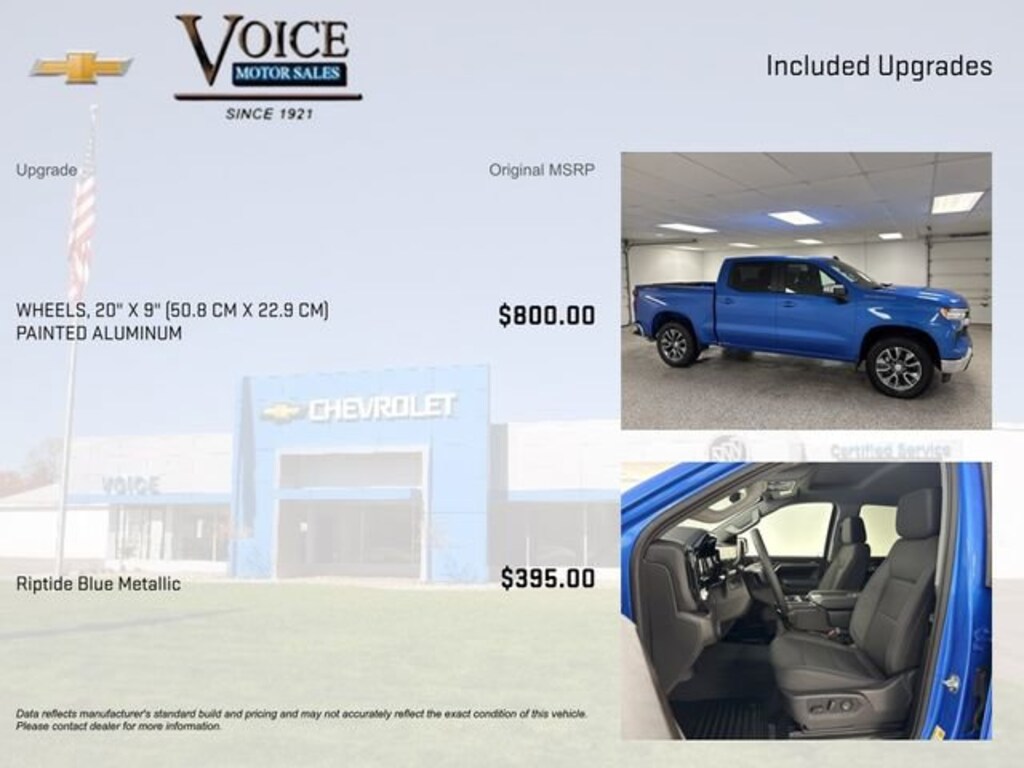 Elevate your driving experience with this stunning 2026 Chevrolet Silverado 1500 LT. Boasting a bold Riptide Blue Metallic exterior and a powerful 2.7L I4 Turbocharged engine, this truck is ready to take on any challenge with its impressive 310 horsepower and 4-wheel drive capabilities. Navigation System Convenience Package High Capacity Suspension Package Preferred Equipment Group 2FL Standard Suspension Package Trailering PackageThe Silverado's impressive list of features doesn't stop there. Enjoy the convenience of dual-zone automatic climate control, a premium audio system, and a 120-volt power outlet in the bed. Stay connected with the Chevrolet Infotainment 3 Premium System, complete with Apple CarPlay, Android Auto, and a Wi-Fi hotspot.Safety is a top priority with this Silverado, featuring advanced driver assistance technologies like Automatic Emergency Braking, Forward Collision Alert, and Lane Keep Assist with Lane Departure Warning. The HD Rear Vision Camera and Hitch Guidance make towing and parking a breeze.Elevate your driving experience with the premium touches, including heated front seats, a heated steering wheel, and a 12.3-inch reconfigurable digital display. The Silverado's spacious interior and versatile cargo bed make it the perfect companion for your next adventure.Experience the power, technology, and style of the 2026 Chevrolet Silverado 1500 LT. Visit our showroom today and let us help you find the perfect truck to fit your needs.New vehicle pricing is based on GM Employee Discount pricing and includes current offers and incentives. All others pay slightly more. While great effort is being made to ensure the accuracy of the information on this site, errors do occur so please verify information with a customer service representative. Voice Motor Sales is family owned and operated with over 105 years dedicated to your automotive satisfaction. Since 1921 Thank You for Making Voice Your Choice!
