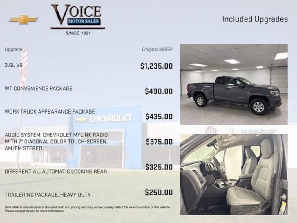 Discover the versatile and capable 2017 Chevrolet Colorado Work Truck, a truck that's ready to tackle any job or adventure. With its rugged 4WD capabilities, powerful V6 engine, and a host of impressive features, this Colorado is the perfect companion for work or play. 3.6L V6 DI; VVT engine WT Convenience Package Work Truck Appearance Package Heavy-Duty Trailering Package Chevrolet MyLink Radio with 7 Diagonal Color Touch-Screen Automatic Locking Rear DifferentialThis Colorado Work Truck is built to impress, with a bold exterior featuring a body-color rear bumper, chrome beltline moldings, and 16 Ultra Silver Metallic cast aluminum wheels. The WT Convenience Package adds remote keyless entry, a theft-deterrent system, cruise control, and an EZ-Lift tailgate, making your daily tasks a breeze.Inside, you'll find a well-appointed cabin with cloth seating, a power driver's seat, and a 6-speaker audio system with Bluetooth connectivity. The Chevrolet MyLink infotainment system with a 7 color touch screen puts a wealth of connectivity and entertainment at your fingertips.When it comes to capability, the Colorado Work Truck delivers. The robust 4WD system and available Heavy-Duty Trailering Package make this truck a true workhorse, ready to tow your gear or tackle tough terrain. With a fuel-efficient 24 MPG highway rating, you can go the distance without sacrificing performance.Whether you're hauling equipment, towing a trailer, or exploring the great outdoors, the 2017 Chevrolet Colorado Work Truck is up for the challenge. Experience the uncompromising power and versatility that this truck has to offer. Visit our showroom today and let us demonstrate how the Colorado Work Truck can transform the way you work and play.While great effort is being made to ensure the accuracy of the information on this site, errors do occur so please verify information with a customer service representative. Voice Motor Sales is family owned and operated with over 104 years dedicated to your automotive satisfaction. Since 1921 Thank You for Making Voice Your Choice!