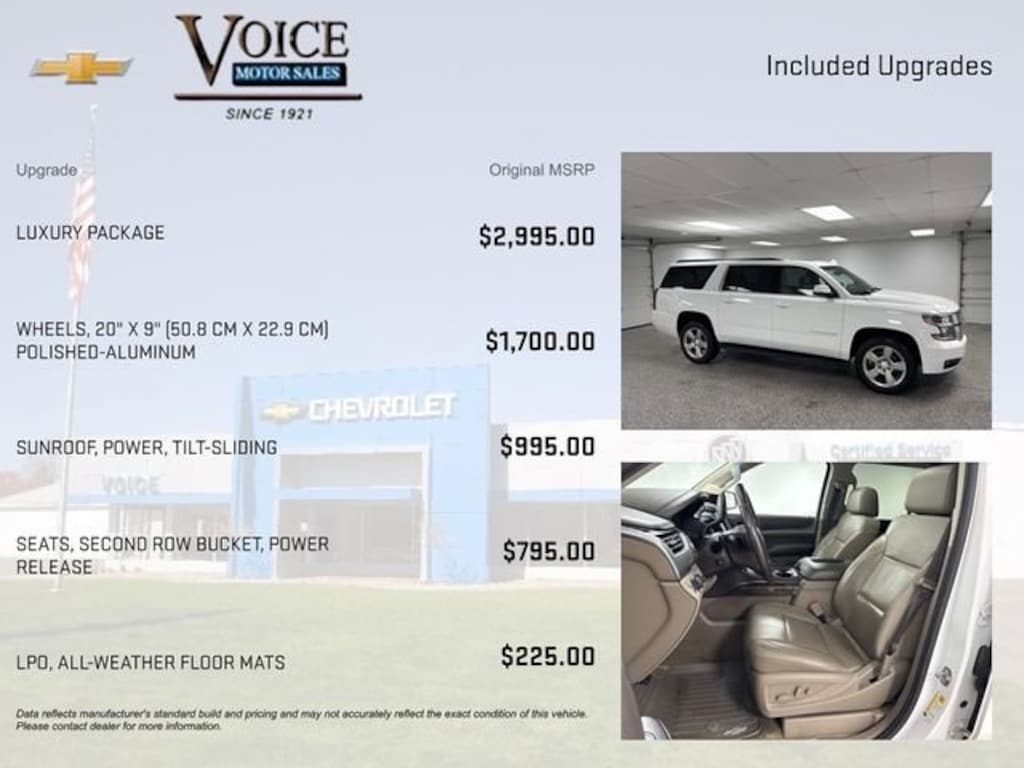 Elevate your driving experience with this exceptional 2017 Chevrolet Suburban LT. This full-size SUV boasts a commanding presence and uncompromising capability, making it the perfect companion for your adventures.Meticulously equipped, this Suburban features an impressive array of premium amenities: Luxury Package: Includes power-folding third-row seats, passive entry system, wireless charging, heated steering wheel, and more 20 Polished-Aluminum Wheels Power Tilt-Sliding Sunroof Heated Second-Row Seats Hands-Free Power Liftgate Bose Premium Audio SystemThe Suburban's EcoTec3 5.3L V8 engine and 4-wheel drive powertrain deliver exceptional performance and efficiency, with an impressive 22 MPG on the highway. Enjoy the confidence of advanced safety features like Forward Collision Alert, Lane Keep Assist, and Rear Cross-Traffic Alert.Step inside and be captivated by the spacious, luxurious cabin. Leather-appointed seating, heated and power-adjustable front seats, and a versatile second-row configuration ensure comfort and convenience for all your passengers. The Chevrolet MyLink infotainment system with Apple CarPlay and Android Auto integration keeps you connected and entertained on the go.Whether you're transporting the family, towing a trailer, or embarking on a road trip, this 2017 Suburban LT is ready to exceed your expectations. Experience the perfect blend of power, capability, and refined luxury. Schedule a test drive today and discover why the Suburban is the ultimate full-size SUV.While great effort is being made to ensure the accuracy of the information on this site, errors do occur so please verify information with a customer service representative. Voice Motor Sales is family owned and operated with over 105 years dedicated to your automotive satisfaction. Since 1921 Thank You for Making Voice Your Choice!