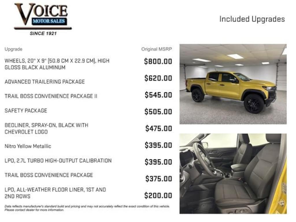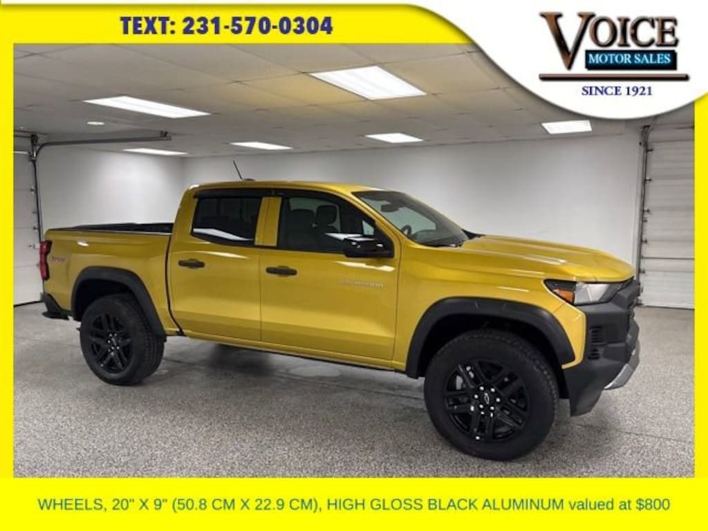 Contact Voice Motor Sales Chevrolet of Kalkaska Michigan 231-258-9178 or email sales@voicemotors.com. All Trades Welcome. At Voice Motor Sales we work with a variety of banks and credit unions to get you the finance rates that work best with your budget. Voice Motor Sales is family owned and operated with over 104 years dedicated to your automotive satisfaction. Since 1921 Thank You for Making Voice Your Choice!Recent Arrival! CARFAX One-Owner. Clean CARFAX. Priced below KBB Fair Purchase Price! Odometer is 4347 miles below market average!2023 Nitro Yellow Metallic Chevrolet Colorado Trail Boss 4WD 4D Crew Cab 2.7L Turbo 8-Speed AutomaticJet Black w/Cloth Seat Trim, 1st & 2nd Row All-Weather Floor Liner (LPO), 2.7L Turbo High-Output Calibration (LPO), 220 Amp Generator, 3.42 Rear Axle Ratio, 4-Way Manual Passenger Seat Adjuster, 4-Wheel Disc Brakes, 6 Speakers, 6-Speaker Audio System Feature, 6-Way Manual Driver Seat Adjuster, 8-Way Power Driver Seat Adjuster, ABS brakes, Advanced Trailering Package, Air Conditioning, Alloy wheels, AM/FM radio: SiriusXM, Apple CarPlay/Android Auto, Auto High-beam Headlights, Automatic Emergency Braking, Black Painted Mirror Caps, Black Spray-On Bedliner w/Chevrolet Logo, Blind Zone Steering Assist, Brake assist, Chevy Safety Assist, Cloth Seat Trim, Compass, Delay-off headlights, Driver door bin, Driver vanity mirror, Dual front impact airbags, Dual front side impact airbags, Electronic Automatic Cruise Control, Electronic Stability Control, EZ-Lift & Lower Tailgate, Following Distance Indicator, Forward Collision Alert, Front anti-roll bar, Front Bucket Seats, Front Center Armrest, Front Pedestrian & Bicyclist Braking, Front wheel independent suspension, Heated Power-Adjustable Outside Mirrors, Heavy-Duty Trailering Package, Illuminated entry, Integrated Trailer Brake Controller, IntelliBeam Automatic High Beam On/Off, Lane Keep Assist w/Lane Departure Warning, Low tire pressure warning, Manual Rear-Sliding Window, Navigation System, Occupant sensing airbag, Outside temperature display, Overhead airbag, Overhead console, Panic alarm, Passenger door bin, Passenger vanity mirror, Power door mirrors, Power Driver Lumbar Control Seat Adjuster, Power steering, Power windows, Preferred Equipment Group 0TR, Radio data system, Radio: 11.3 Diagonal Advanced Color LCD Display, Rear Cross Traffic Braking, Rear Park Assist, Rear reading lights, Rear step bumper, Rear-Window Electric Defogger, Remote keyless entry, Safety Package, Security system, SiriusXM Radio, Speed-sensing steering, Split folding rear seat, Steering Wheel Mounted Audio Controls, Steering wheel mounted audio controls, StowFlex Tailgate Storage Compartment, Tachometer, Tailgate Keyed Cylinder Lock, Tilt steering wheel, Traction control, Trail Boss Convenience Package, Trail Boss Convenience Package II, Trailering App, Trip computer, Variably intermittent wipers, Wheels: 18 x 8.5 Black High Gloss Aluminum, Wheels: 20 x 9 High Gloss Black Aluminum, Wireless Phone Projection, Jet Black w/Cloth Seat Trim.